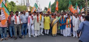जश्न मनाते भाजपा नेता व कार्यकर्ता।