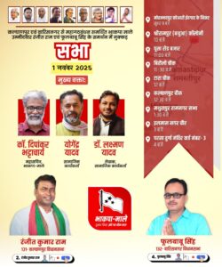 Oini 24 डेस्क समस्तीपुर। समस्तीपुर जिला के कल्याणपुर विधानसभा से महागठबंधन उम्मीदवार रंजीत कुमार राम व वारिसनगर से महागठबंधन उम्मीदवार फूल बाबू सिंह के समर्थन में आयोजित चुनावी सभा में शामिल होने के लिए स्टार प्रचारक एवं भाकपा (माले) के राष्ट्रीय महासचिव दीपंकर भट्टाचार्य, सामाजिक कार्यकर्ता एवं किसान नेता योगेंद्र यादव, डॉ लक्ष्मण यादव कल सुबह पूसा पहुंचेंगे। जहां मोहम्मदपुर कोआडी में महागठबंधन उम्मीदवार रंजीत कुमार राम के समर्थन में आयोजित सभा को संबोधित करेंगे।